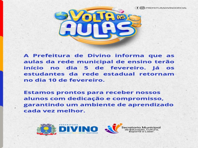 No dia 5 de fevereiro, os alunos da rede municipal retornam às escolas para mais um ano de aprendizado e crescimento. Já na rede estadual, o início será no dia 10 de fevereiro.