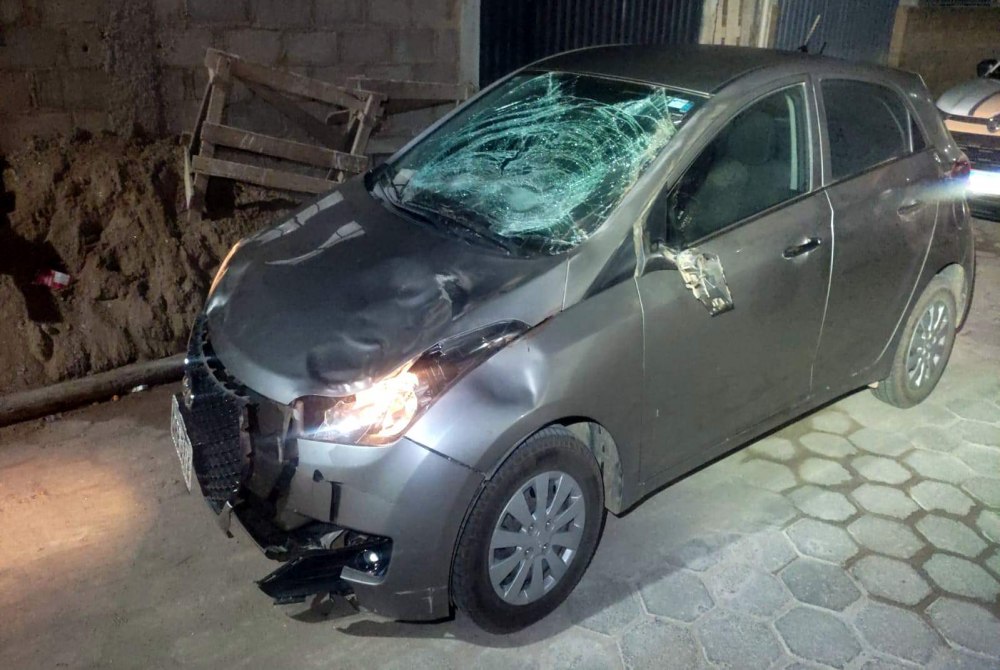 O veículo, um Hyundai/HB20 de cor prata, teve diversos danos, incluindo para-choque dianteiro, para-brisa, capô, para-lama dianteiro esquerdo, retrovisor esquerdo e porta traseira esquerda.
