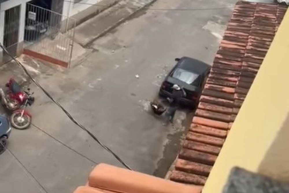 De acordo com as imagens, o suspeito procurava o filho do morador e, ao ser informado de que ele não estava em casa, teria ordenado que o seu cachorro atacasse um cão de pequeno porte que se encontrava em frente ao portão.